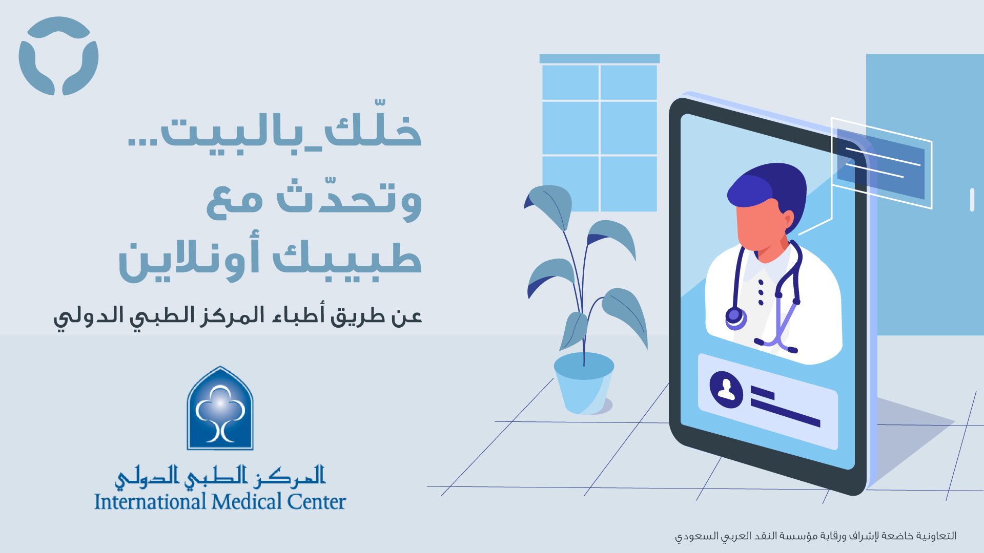 International Medical Center المركز الطبي الدولي من أجل سلامتكم أطلقنا خدمة عافيتك أونلاين للتواصل المرئي والسمعي مع أطباء المركز الطبي الدولي لتتمكنوا من حجز مواعيدكم و الحصول على الاستشارة الطبية في