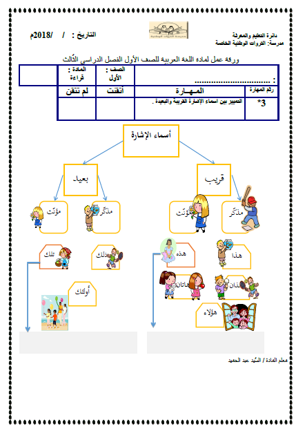 ورقة عمل الاسماء الاشارة القريب والبعيد لمادة اللغة العربية الصف الاول الفصل الثالث منتديات صقر الجنوب